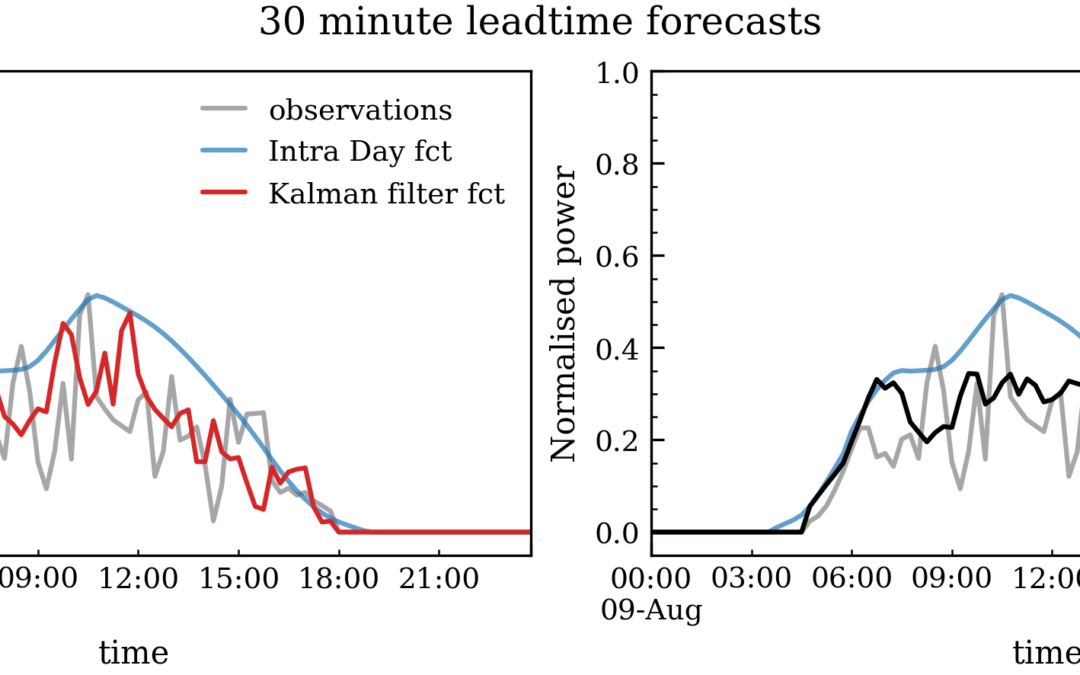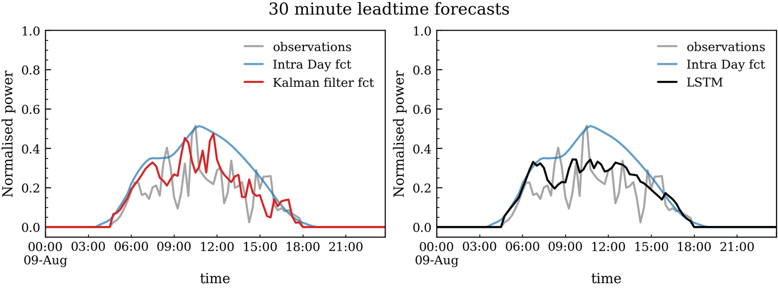 Both Kalman Filter and LSTM forecast improve the forecast performance when compared to the physical intraday forecast. As shown in Figure 2, the Kalman Filter in red on the left panel and LSTM in black on the right panel better represent the observations in grey than the intraday forecast in blue. The Kalman filtered forecast shows prominent delayed peaks and troughs, while the LSTM more closely represents the mean behaviour of the observations and improves the intraday forecast.